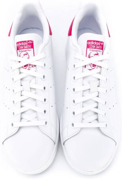 Stan Smith sneakers van adidas Originals Kids voorzien van ronde neus, platte rubberen zool, veters aan voorkant, contrasterende hak, geperforeerd en logo embleem op de tong. POSITIVELY CONSCIOUS: adidas Group scoort 4 op 5 bij het ethische bedrijf Good On You. Veel producten worden van milieuvriendelijke materialen gemaakt - 100% van het katoen is afkomstig van duurzame bronnen en het is vastbesloten om 100% gerecycled polyester te gebruiken voor 2024. Het traceert en controleert bijna de hele productieweg om goede arbeidsvoorwaarden te garanderen, en heeft toegezegd om koolstof- en watergebruik te verminderen bij alle leveranciers.