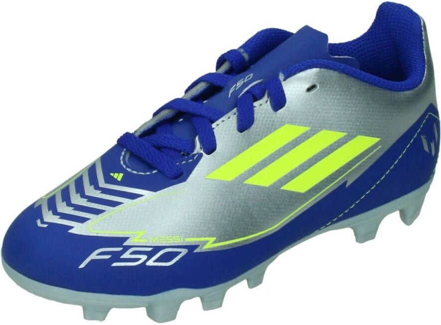 Maak bewegingen zoals de beste om het te doen met deze junioren F50 Messi Club FG voetbalschoenen van adidas. In een Silver Metallic en Lucid Blue kleurencombinatie, hebben deze clubschoenen een ondersteunend synthetisch bovenwerk en een lichtgewicht, flexibele tong. Onder de voet zit de gedempte binnenzool boven een veelzijdige stevige grond buitenzool voor grip en behendigheid bij hoge snelheden. Afgewerkt met Solar Yellow 3-Stripes, de F50 branding en het kenmerkende Messi logo. | IH0926. Material: Synthetische bovenkant