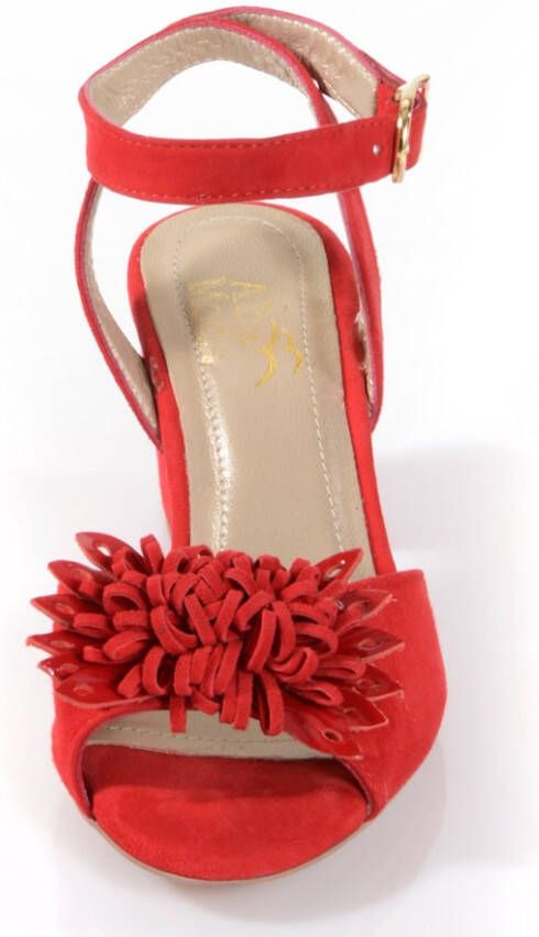 Sandaaltje van zacht geitensuède met verfijnde bloemapplicatie. Verstelbaar riempje dat om de enkel te wikkelen is, met goudkleurige gesp. Beklede blokhak van ca. 6 cm. Voering en gepolsterde binnenzool van geitenleer. Zool van thermoplastisch rubber.