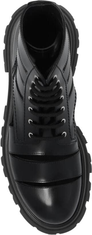 Zwarte enkellaarsjes van Alexander Mc Queen. Gemaakt van leer, dit veterschoenmodel heeft een zwarte rubberen zool en heeft een amandelvormige neus en decoratieve uitsparingen. Zoolhoogte: 3cm Zoolhoogte op het hoogste punt: 4, 5cm