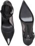 Zwart, mesh vlak, puntige neus, enkelbandje met gespsluiting, voetbed met logo en hoge hak.
