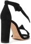 Getextureerde afwerking, binnenzool met logo, hoge blokhak, open neus en enkelbandje met striksluiting.