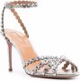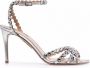 Open neus, kristallen versiering, binnenzool met logo, hoge hak en enkelbandje met gespsluiting. Materiaal: leder.