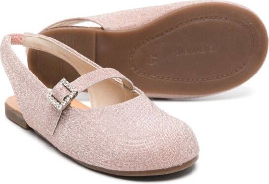 lichtroze glitterdetail klittenbandsluiting met stras ronde neus slip-on stijl elastische slingback riempje platte rubberen zool leren binnenzool met logo lederen voering