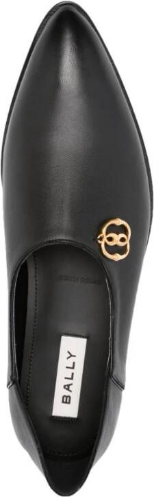 Gitzwart, kalfsleer, discrete stiksels, goudkleurig logo, puntige neus, slip-on stijl, leren binnenzool met logo en leren zool.