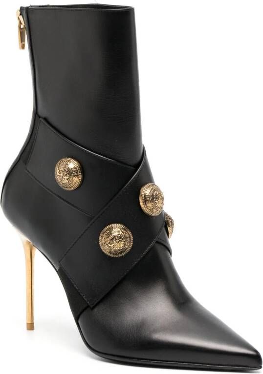 Gitzwart, kalfsleer, gladde korrel, knopen met gegraveerd logo, puntige neus, rits aan de achterkant en hoge stilettohak.