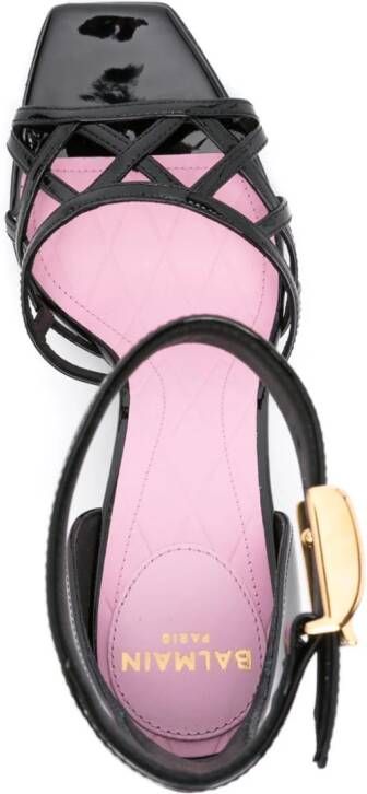 zwart kalfsleer lakleren afwerking open neus voorband met meerdere kruisbanddetails goudkleurige hardware met gegraveerd logo leren binnenzool met logo 95 mm stiletto-hak leren zool gespsluiting Dit item wordt verkocht met een beschermhoes.