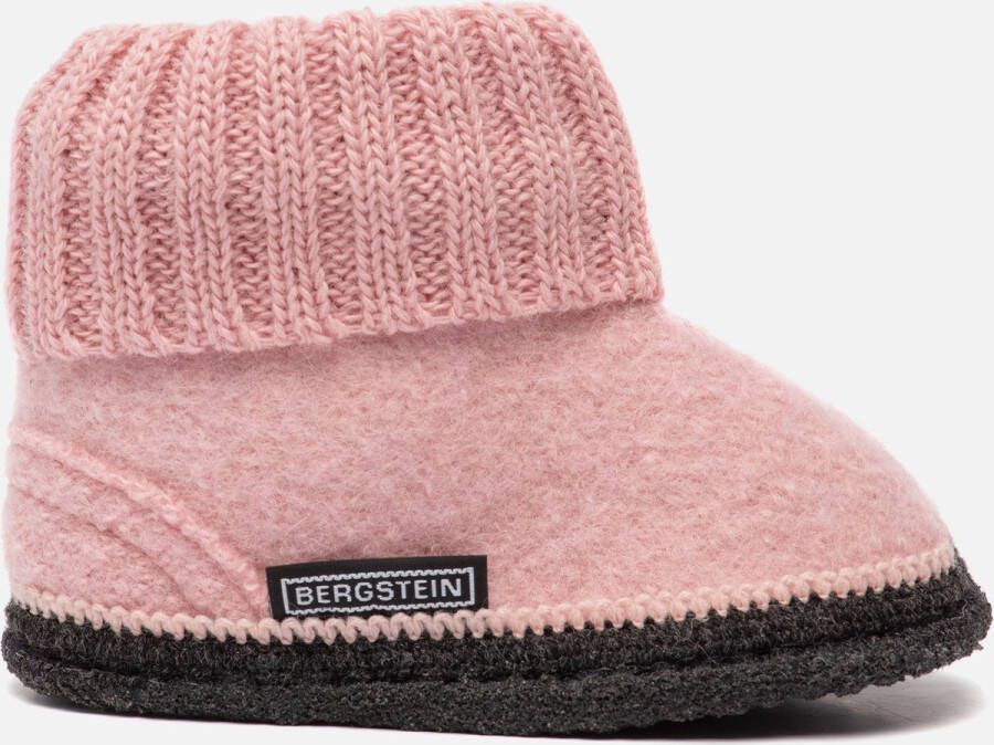 Roze Bergstein Cozy Pantoffels van het populaire merk Bergstein is een duurzame slof gemaakt van zuivere scheerwol. De slof heeft een wollen binnenzool en een gebreide boord die mooi aansluit rond de enkel