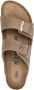 Zandbruin, kalfsleer, open neus, logo-relif aan de zijkant, gegraveerd logo, dubbele gespsluiting, leren binnenzool met logo, platte rubberen zool en slip-on stijl.
