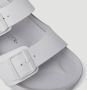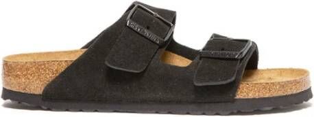 Zwarte ‘Arizona BS’ glijdt vanuit Birkenstock. Gemaakt van leer, dit model beschikt over twee verstelbare gesp banden, een reliëflogo aan de zijkant, een anatomisch gevormde kurk-latex voetbed en een zwarte natuurlijke kurkzool met een EVA-schuimafwerking. Smalle breedte.
