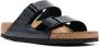 Zwart, kalfsleer, lakleren afwerking, open neus, dubbele gespsluiting, voorgevormd voetbed en rubberen buitenzool.