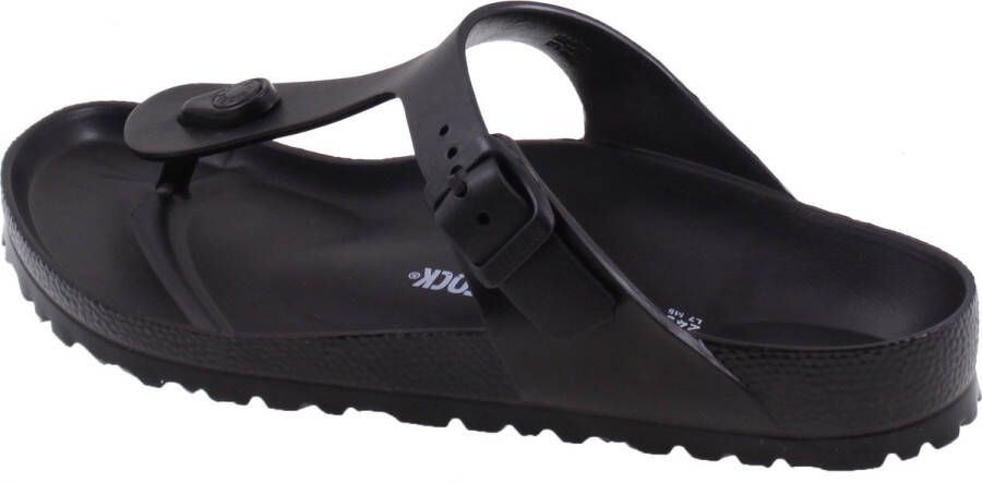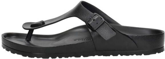 Zwarte Birkenstock Gizeh EVA slippers gemaakt van zacht, flexibel, UV- en weerbestendig, isolerend, licht van gewicht en slijtvast materiaal. Dit materiaal is duurzaam en neemt geen vocht op. De Birkenstock slippers zorgen voor optimaal comfort en ondersteuning voor jouw voeten. De Birkenstock Gizeh slippers hebben een verstelbare riem waardoor de slippers af te stellen zijn aan de vorm van de voeten. Aan de binnenzijde van de slippers zit een merkopdruk. De Birkenstock Gizeh EVA slippers hebben een normale tot brede pasvorm.