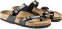 Mayari Birkestock-teenslippers voor dames in zwart geverfde Birko-flor. Pas de lengte van de riem één keer aan en de flat is in een mum van tijd aan en uit te trekken. Deze teenslipper draait zachtjes rond de grote teen, terwijl de twee verstelbare bandjes op de wreef hem perfect aanpassen. Voorzien van een zeer lichte EVA-bodem en lederen voetbed. Bikenstock is een kwaliteit made in Germany. Details: - Type: pantoffel met open voorkant - Hakken hoogte: platte schoenen - Kleur(en): zwart - Patroon: glitter - Meer details: met riem - Stijl: casual - Gelegenheid: uitgaan, zomer