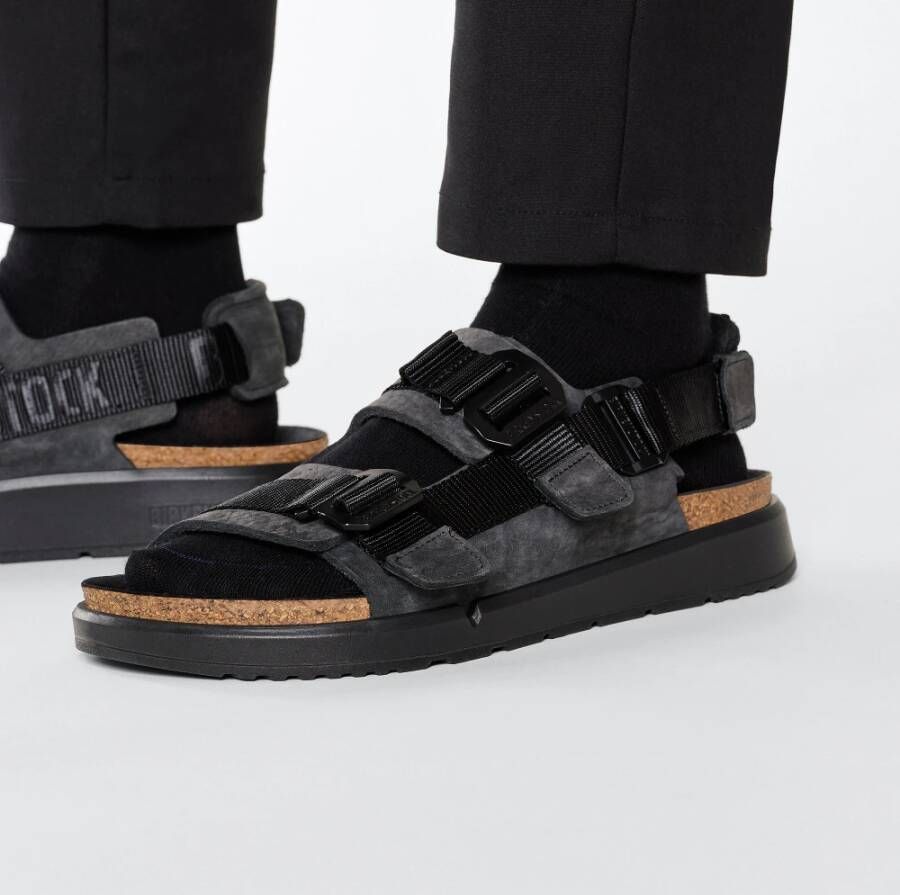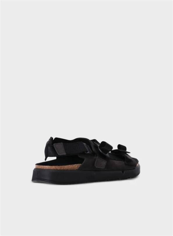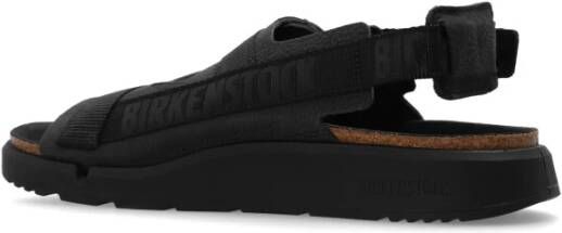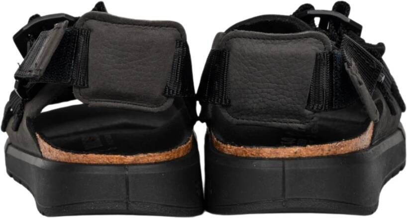 Zwarte Shinjuku sandalen van Birkenstock. Gemaakt van leer en stof, dit model zit op een zwarte rubberen zool en toont het logo van het merk aan de zijkant, verstelbare bandjes en een anatomisch gevormd kurk-latex voetbed in standaard breedte. Zoolhoogte: 2cm Zoolhoogte op het hoogste punt: 3cm