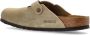 Beige Birkenstock leren slippers voor mannen met ronde neus, zijdelings gempregneerd logo, sluiting met voorband en smalle pasvorm. Schoen valt normaal qua maat