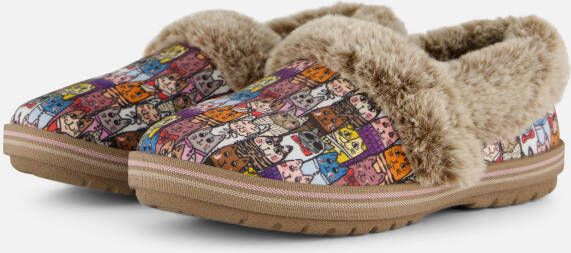 Skechers dames pantoffel Altijd iets vrolijks aan je voeten met deze originele print. Gevoerd met heerlijk zacht fake fur wat voor comfort en warme voeten zorgt. De kraag is tevens volledig gevoerd met fake fur