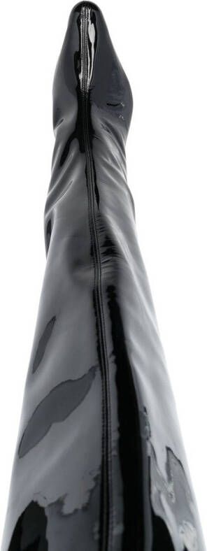 Zwart, kalfsleer, lakleren afwerking, instapmodel, amandelvormige neus en hoge hak.