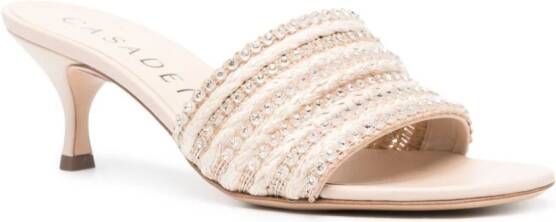 lichtroze ronde open neus verfraaid met kristallen gevlochten details voetbed met logo leren voering kittenhak leren zool slip-on stijl