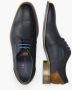 Een stijlvolle veterschoen met een verfijnde uitstraling. Dit model River van Daniel Kenneth is gemaakt van donkerblauw leer met een microprint. Op het hielstuk en op de tong zorgt de cognackleurige leren bewerking voor een mooi contrast. Kobaltblauwe accenten in de zool en hak en kobalt en donkerblauwe veters geven de geklede schoenen een