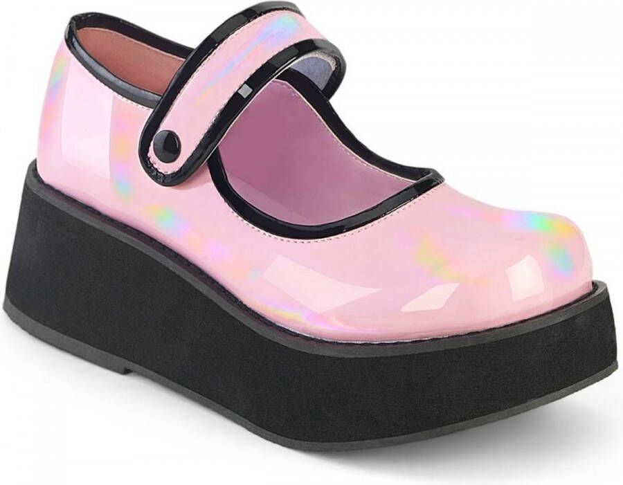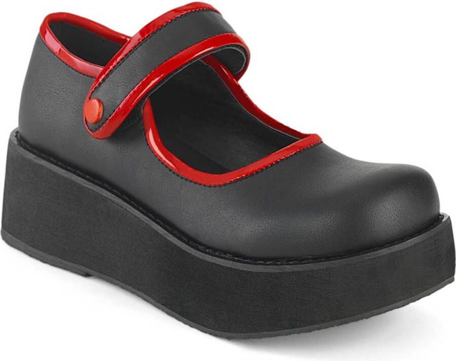 Demonia. 2 1/4"""" (57mm) Platform Hook N Loop Mary Jane w/ Contrast Piping & Button DetailMateriaal:Polyurethaan - Semi-Polyurethaan - Thermoplastisch rubber