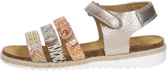 Develab stoere en hippe meisjes sandaal. Deze sandaal van Develab heeft als artikelnummer: 48314-799. De sandaal heeft een voorgevormd kurken voetbed met verstelbare bandjes middels twee gespsluitingen. Het bandje op de voorvoet is rood/roze in reptielprint gecombineerd met pony in dot print. Het achterste bandje is beige met goud accenten. De gespen zijn van goud.