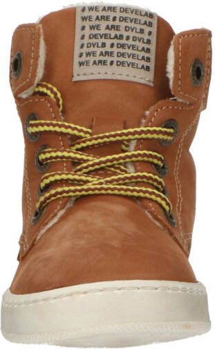 Stoere veterboot van het merk Develab. Deze jongens schoen is uitgevoerd in cognac met cognac-gele veters. Op de tong zit een groot label met #wearedevelab. De veterboot heeft een bovenwerk van leer en de schoen is warm gevoerd. Het voetbed is gemaakt van leer en tevens ook uitneembaar. De witte loopzool is gemaakt van kunststof.