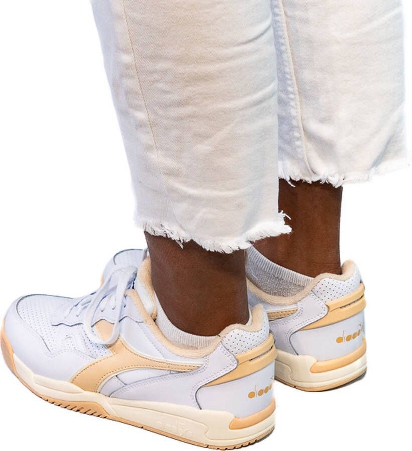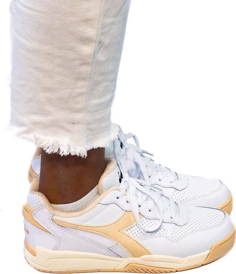 Diadora Winner sneakers voor dames. Deze lage sneaker in de kleur wit met beige heeft een bovenwerk van een combinatie leer en synthetisch materiaal. De zachte voering is van textiel en de Winner beschikt over een uitneembare inlegzool.