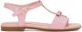 Rose roze, kalfsleer, lakleren afwerking, strikdetail, goudkleurig logo, enkelbandje met gespsluiting, T-bar bandje, perforatie details, leren binnenzool met logo, open neus en lage blokhak.
