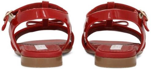 Rozerood, kalfsleer, lakleren afwerking, goudkleurig logo, strikdetail, T-bar bandje, enkelbandje met gespsluiting, open neus, leren binnenzool met logo en platte rubberen zool.