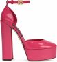 Blush roze, glanzende afwerking, binnenzool met logo, enkelbandje met gespsluiting, ronde neus, hoge stilettohak en contrasterende afwerking.