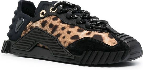 Tweekleurig design, luipaardprint, ronde neus, vetersluiting aan de voorkant en platte zool.