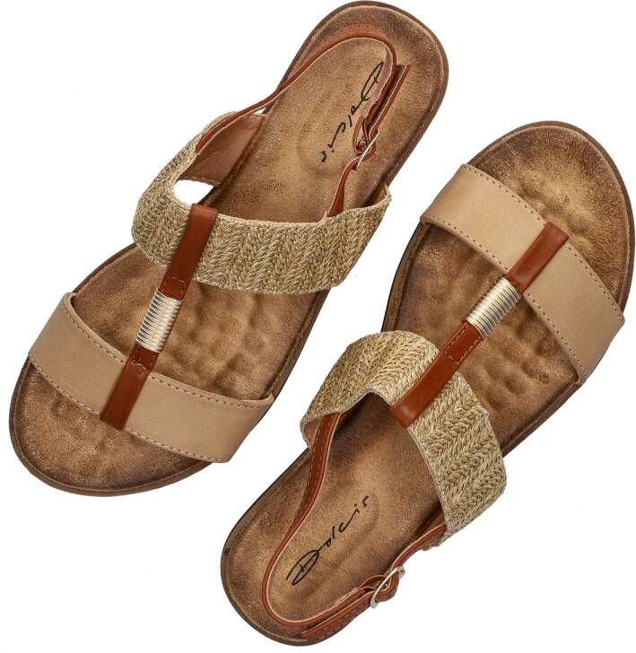 Dolcis dames sandaal Deze leuke sandaal van Dolcis is makkelijk te combineren met je zomerkleding. Uitgevoerd in imitatieleer met raffia-weefwerk op de band. De enkelband is verstelbaar met de gesp. De banden zij aan de binnenzijde afgewerkt met imitatieleer. Voorzien van een dempend voetbed wat de voeten ontlast en minder snel vermoeid maakt. Afgewerkt met een rubberen loopzool met voldoende grip.