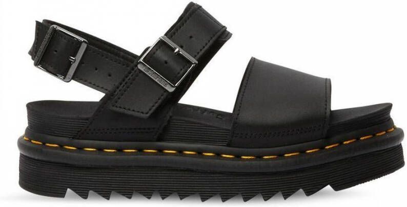 Stap in stijl met deze platte sandalen van Dr. Martens. Het Voss 24233001Black model heeft een brede zwarte leren band met een verstelbare gespsluiting. De gele contraststiksels op de rand voegen een vleugje kleur toe aan het ontwerp. De platformzool is stevig en heeft een opvallend, tandachtig profiel. Perfect voor de modebewuste vrouw die een statement wil maken