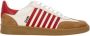 Upgrade je sneaker game met de Dsquared 2 New Jersey sneakers voor heren. Gemaakt van wit leer met beige nubuck inzetstukken en rode zijstrepen, zijn deze sneakers een stijlvolle toevoeging aan je garderobe. Compleet met een logo op de tong, brede katoenen veters, leren en katoenen sponsvoering, leren binnenzool en een 3 cm rubberen zool