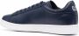 Logo met relif, tong met logoprint, ronde neus, vetersluiting aan de voorkant en platte rubberen zool. Materiaal: leder.