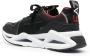 Zwart, baksteenrood, mesh vlak, uitgesneden detail , lusje met logo bij de hiel, logopatch op de tong , ronde neus, vetersluiting aan de voorkant, binnenzool met merk en chunky rubberen zool.