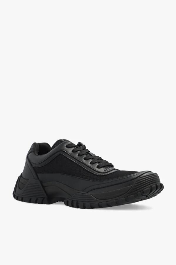 Zwarte sneakers van Emporio Armani. Gemaakt van mesh met leren accenten, heeft dit paar veters een logopatch en zwarte rubberen zool