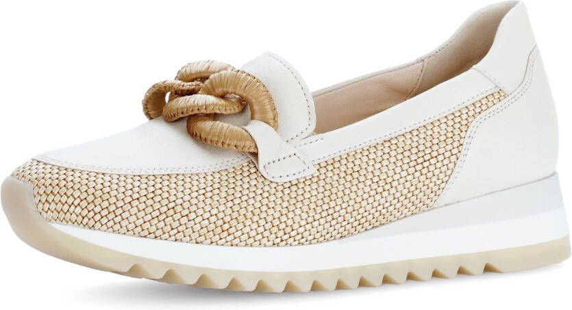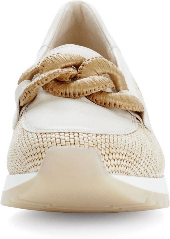 Deze beige Gabor damesloafers van nappaleer combineren verfijning met een moderne twist. Het geweven detail op de neus en de opvallende knoop geven deze schoenen een speelse en unieke uitstraling. Het soepele nappaleer zorgt voor een luxe look en optimaal draagcomfort, terwijl de lichte zool met gekartelde afwerking extra stabiliteit en grip biedt.