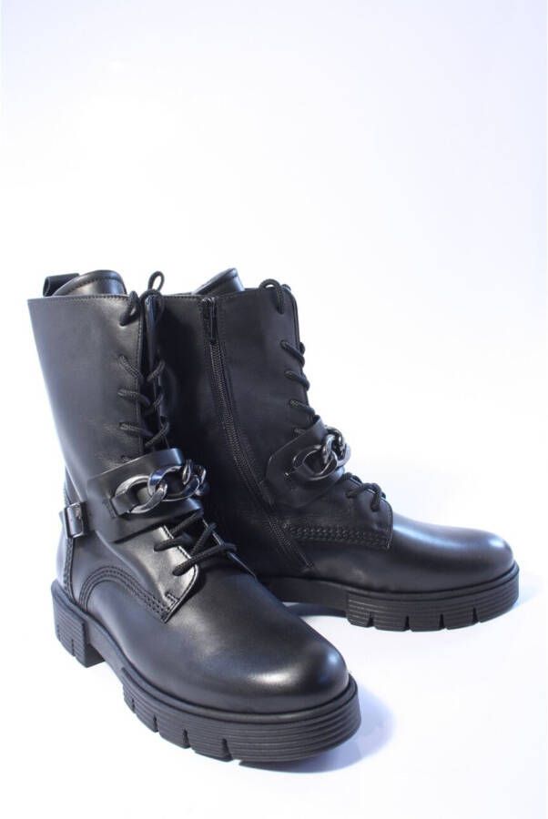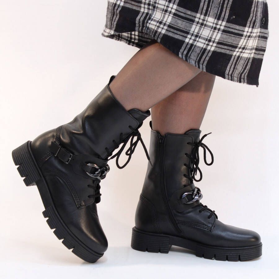 Zwarte Gabor Veterboots. Zwarte Gabor veterlaarzen in mooi kalfsleer, voor een paar stoere veterboots met een zwarte zool. Het sluit mooi op elkaar aan, terwijl het gesp-detail met de zwart-witte schakelketting zorgt voor een opvallend contrast. Dankzij de comfortabele extra wijdte bij de tenen, bal en wreef lopen de Gabor veterlaarzen heerlijk. Met een H wijdte geschikt voor de bredere voet