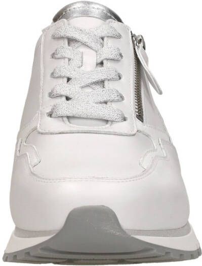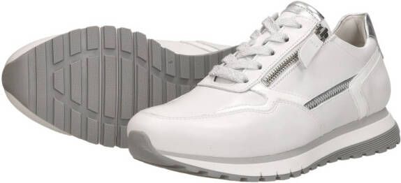 Comfortabele witte damessneaker van Gabor. De sneaker heeft metallic zilveren accenten en een sportieve grijze zool.