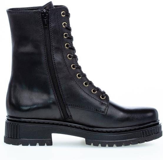 Deze stoere Gabor veterboots in het zwart zijn gemaakt van leer. De voering is gemaakt van textiel en de binnenzool van leer. Ter decoratie zijn er sierstiksels en gouden accenten aangebracht. Door middel van de rits in combinatie met de veters en het lusje aan de achterkant trek je de boots gemakkelijk aan en uit. De boots hebben een Best Fitting-pasvorm waardoor de bal van de voet iets meer ruimte heeft. Dit zorgt voor extra comfort. Omdat de veterboots zijn uitgevoerd in een F-leest, zijn ze geschikt voor smallere voeten. Het voetbed van deze zwarte Gabor veterboots is uitneembaar.