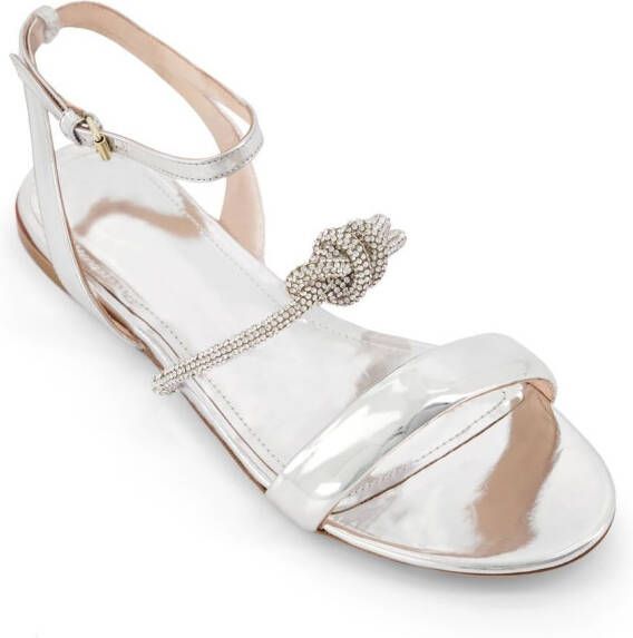 Zilverkleurig, kalfsleer, enkelbandje met gespsluiting, verfraaid met kristallen, strikdetail, open neus en platte zool.
