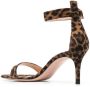 Bruin, kalfssude, luipaardprint, open neus, halfhoge hak en enkelbandje met gespsluiting.