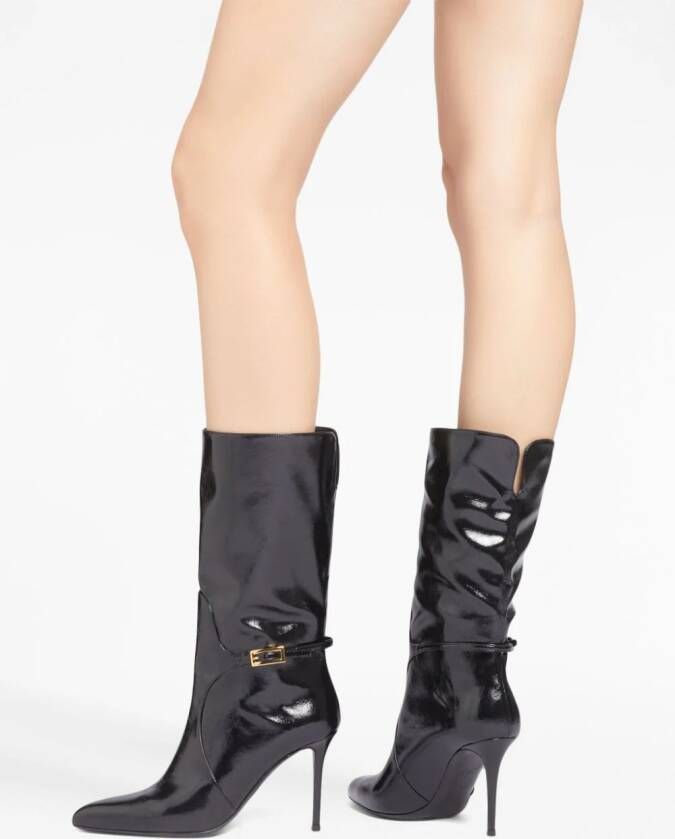 Zwart, kunstleer, decoratief gespdetail, goudkleurig materiaal, puntige neus, driekwart lengte, leren zool en hoge stilettohak.