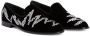 Zwart, leder, fluwelen effect, verfraaid met bergkristallen, amandelvormige neus, binnenzool met logo en platte rubberen zool.