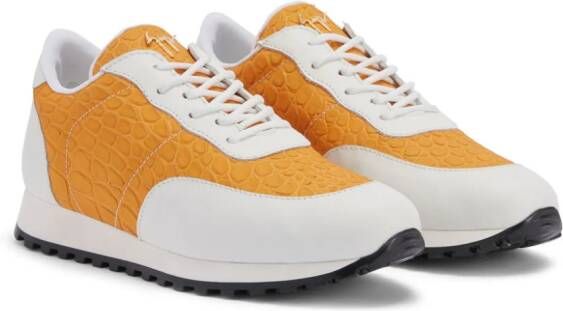 wit/oranje leer vlakken krokodillen-effect relif ronde neus veters aan voorkant logoplakkaat op de tong logo op het hielstuk platte rubberen zool