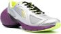 Zilverkleurig, donkerpaars, logopatch aan de zijkant, mesh vlak, tweekleurig design, logopatch op de tong , ronde neus, veters aan voorkant, binnenzool met merk en chunky rubberen zool.