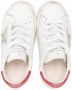 Gebroken wit, lichtgrijs, felroze, kalfsleer, kenmerkende sterpatch aan de zijkant, tong met logoprint, ronde neus, veters aan voorkant, binnenzool met merk en platte rubberen zool.