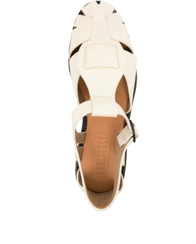 Ivoorwit, kalfsleer, uitgesneden detail , gekooid design, ronde neus, gespsluiting, leren binnenzool met logo, lage gestapelde hak en rubberen buitenzool.