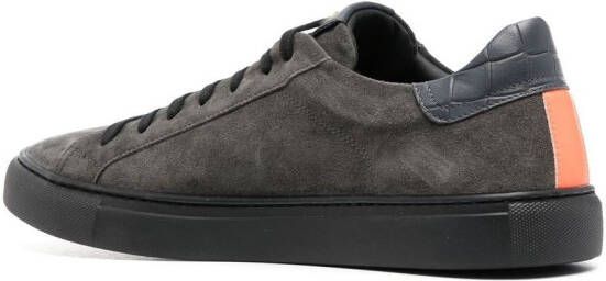 Donkergrijs, kalfssude, logopatch op de tong , ronde neus, vetersluiting aan de voorkant, binnenzool met merk en chunky rubberen zool. .